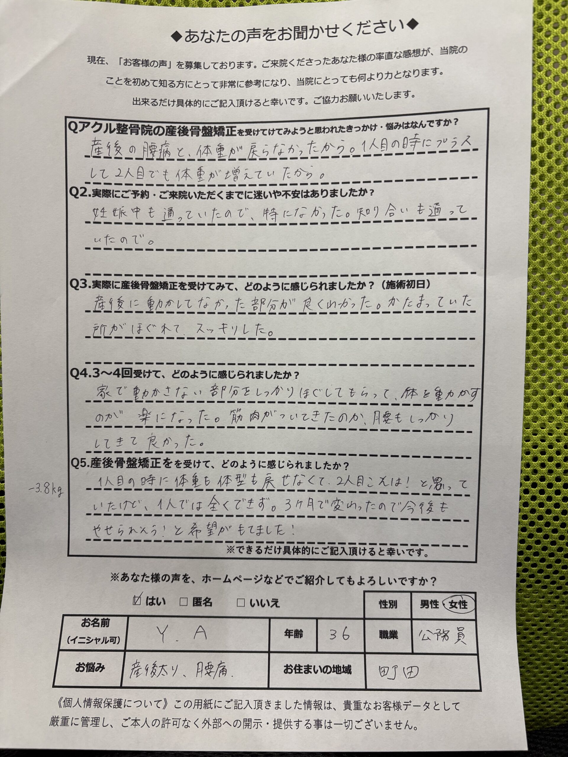 38歳女性/第二子出産/産後5か月/施術期間約4か月/町田市小川在住